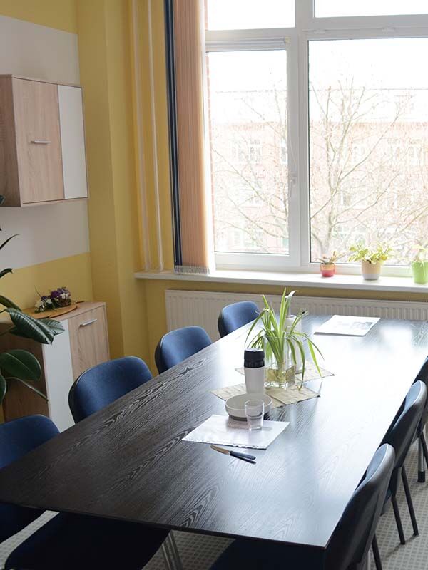 Bei Bedarf bringt Sie ein Fahrstuhl hoch in den zweiten Stock. Über den großzügigen Empfangsbereich mit Sitzecke erreichen Sie die großen lichtdurchfluteten und behindertengerechten Schulungsräume. Der Blick nach draußen fällt Richtung Schloss Friedenstein. Ihr Unterricht findet zwischen 8 und 16:15 Uhr statt.